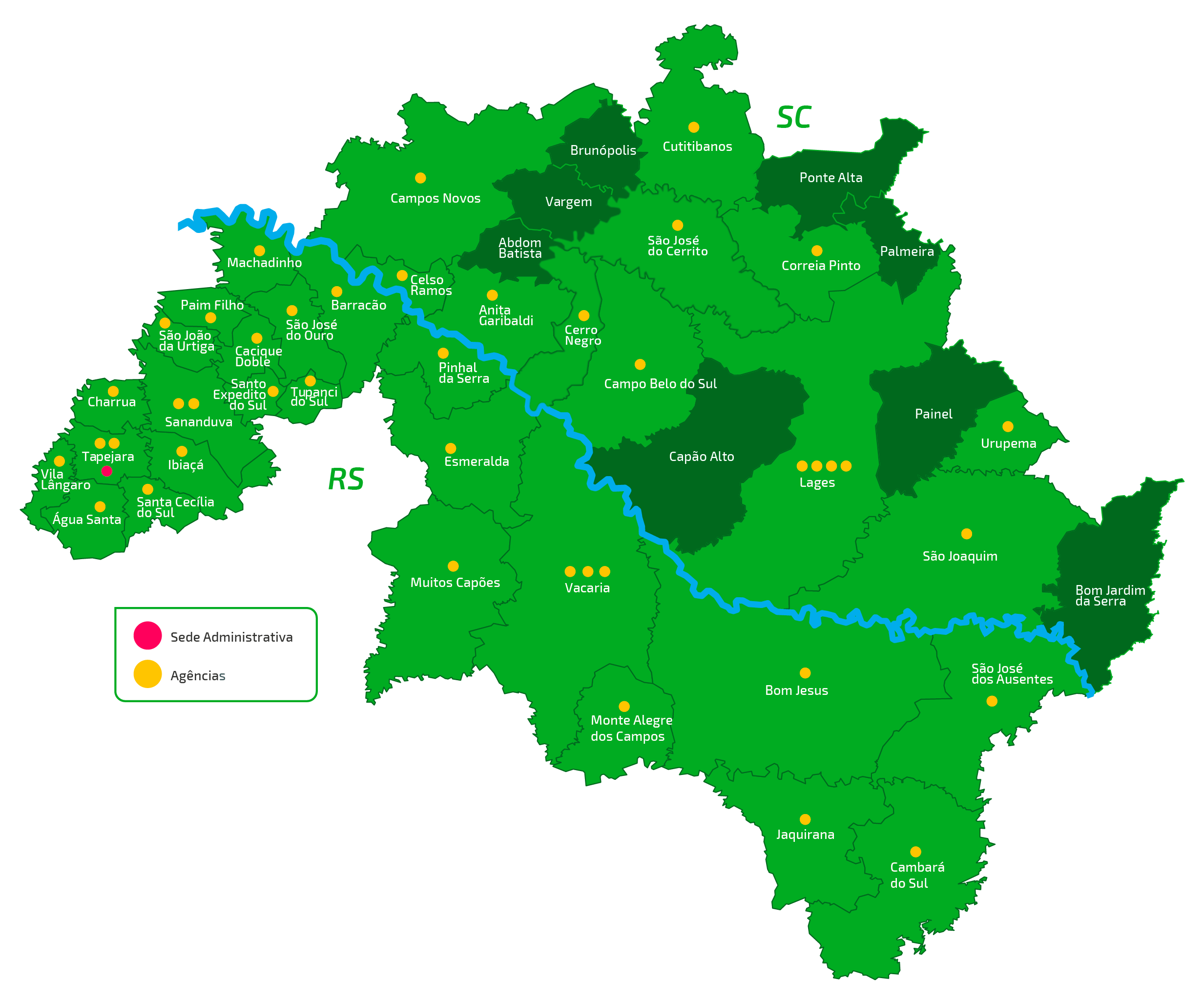 Já estamos presentes nos seguintes municípios: Charrua, Água Santa, Ibiaçá, Vila Lângaro, Tapejara, São João da Urtiga, São José do Ouro, Santo Expedito do Sul, Sananduva, Paim Filho, Tupanci do Sul, Esmeralda, Vacaria, Barracão, Santa Cecília do Sul, Cambará do Sul, Muitos Capões, Machadinho, Bom Jesus, Cacique Doble, Campos Novos, Lages, Pinhal da Serra, Jaquirana, Monte Alegre dos Campos, São José dos Ausentes, São Joaquim, Curitibanos, Anita Garibaldi, Campo Belo do Sul, Correia Pinto, Celso Ramos, Cerro Negro, São José do Cerrito e Urupema.