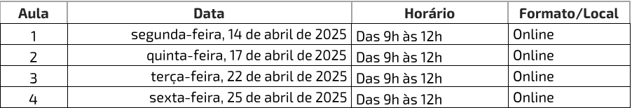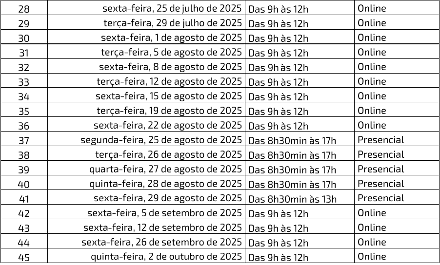 Aulas online e uma semana presencial, conforme calendário abaixo: