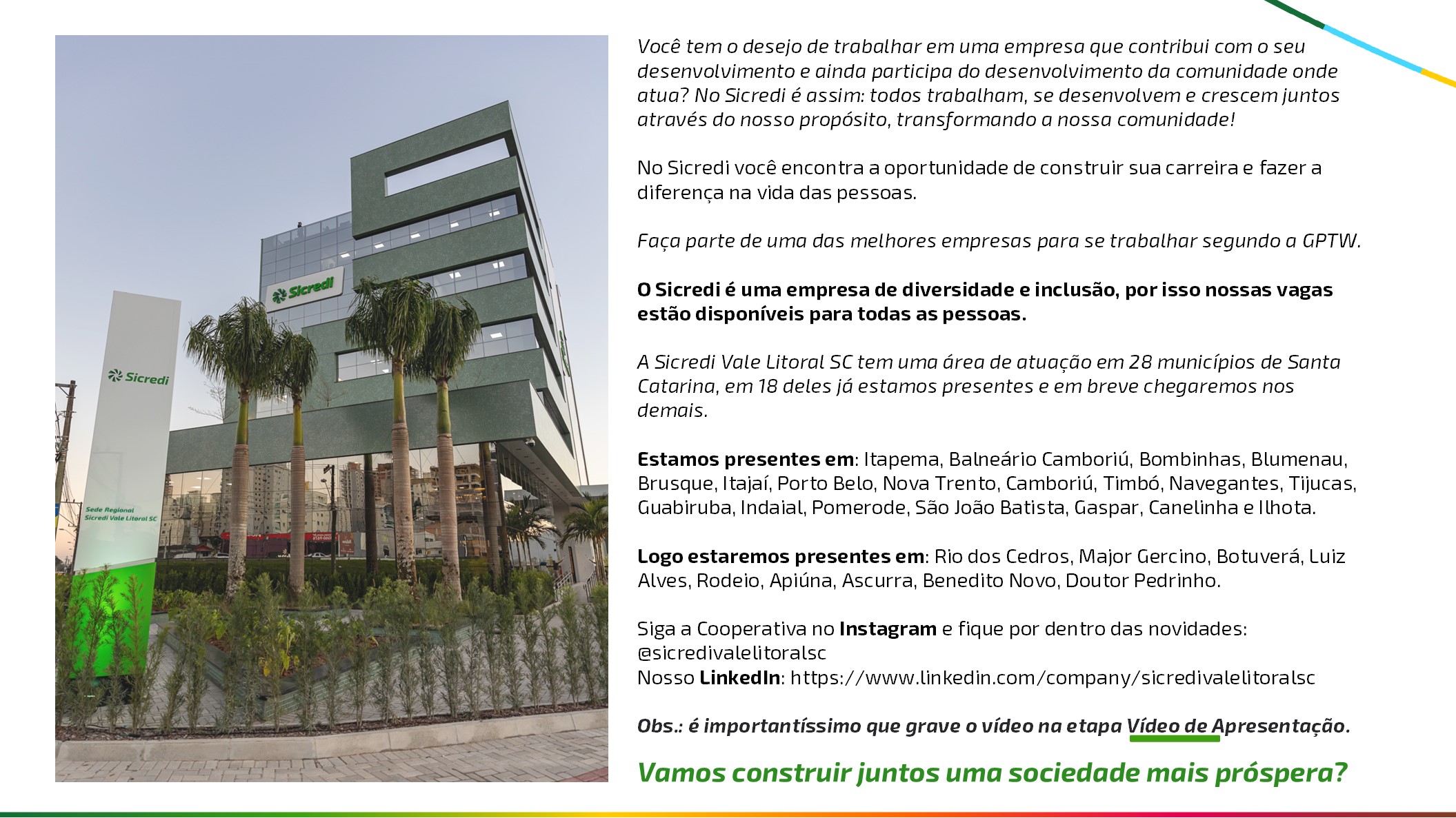 Seguimos buscando talentos que queiram fazer parte da construção de um mundo melhor e queremos contar com você. #VemSerSicredi!